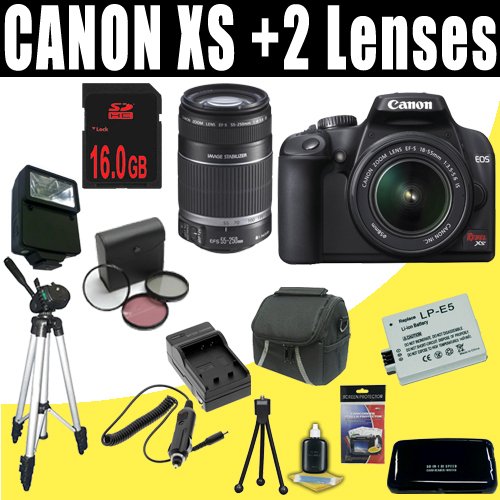 Canon Rebel XS 10.1MP Digital SLR Camera with EF-S 18-55mm f/3.5-5.6 IS Lens (Black) + EF-S 55-250mm f/4.0-5.6 IS Telephoto Zoom Lens + 16GB Deluxe Accessory Kit Overview